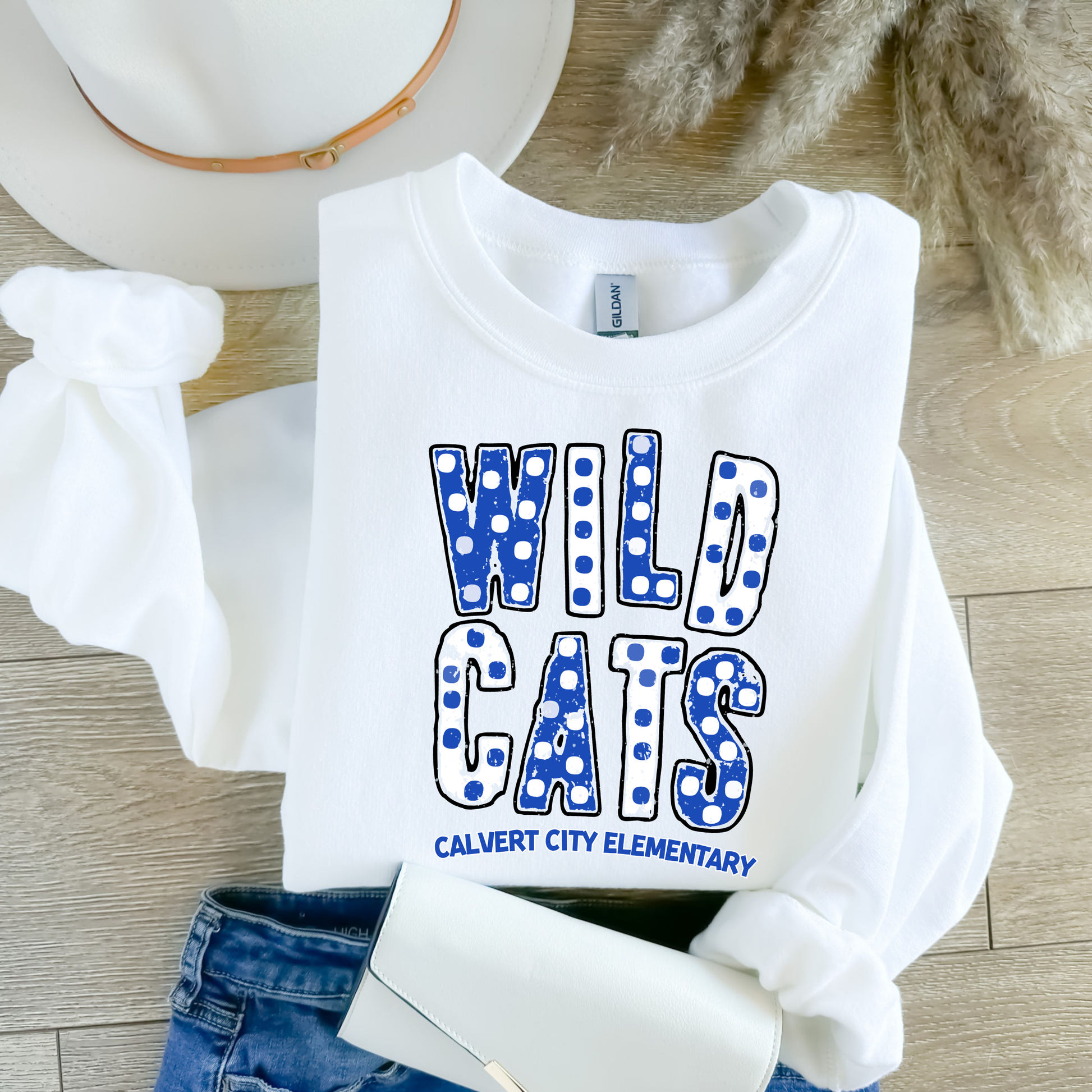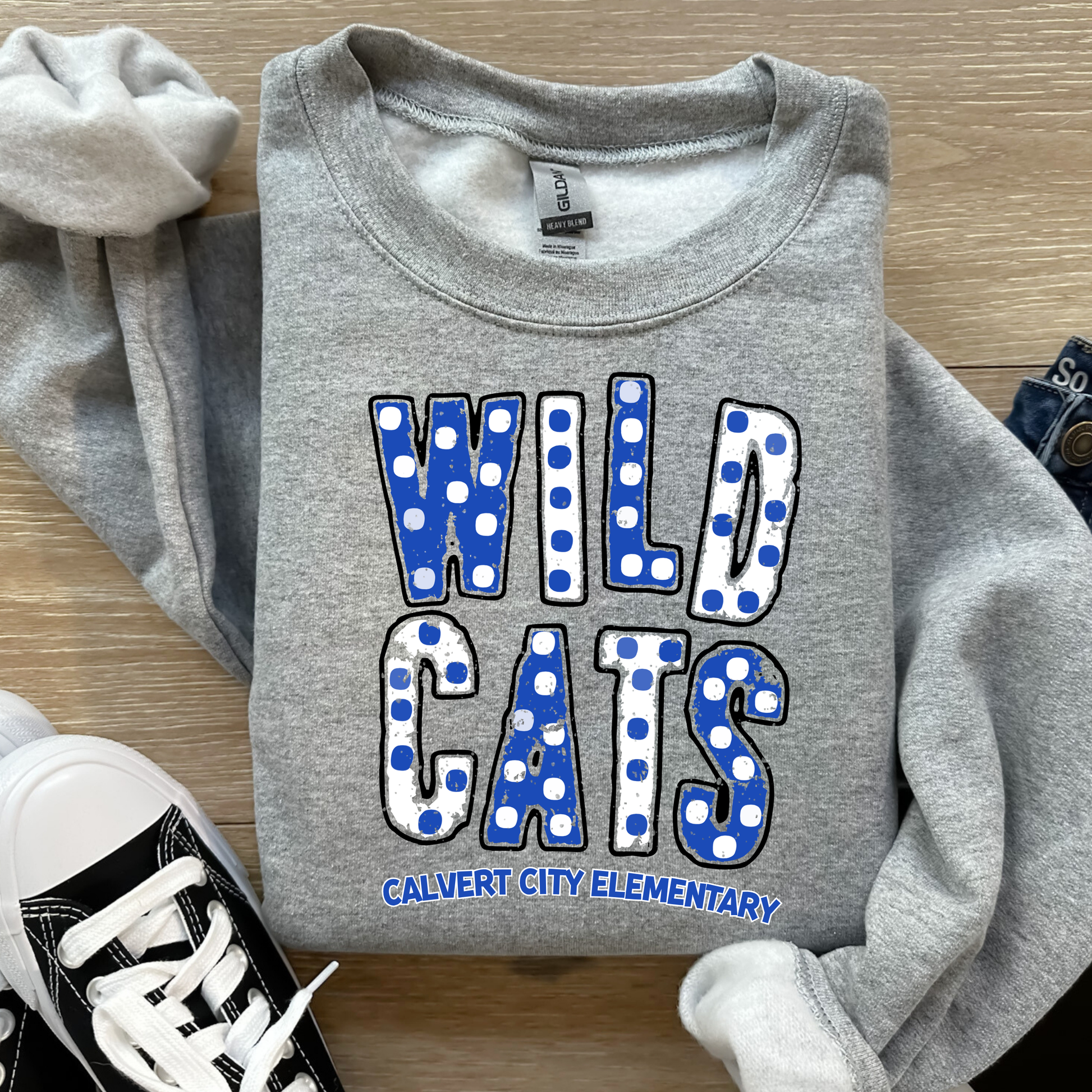 Show your Wildcat pride in style with our brand new Calvert City Wildcats Dots Collection! This fun and energetic design features a bold, eye-catching polka dot pattern integrated into the "Wildcats" lettering, making a statement wherever you go. "Calvert City Elementary" is proudly displayed underneath, showcasing your school spirit.