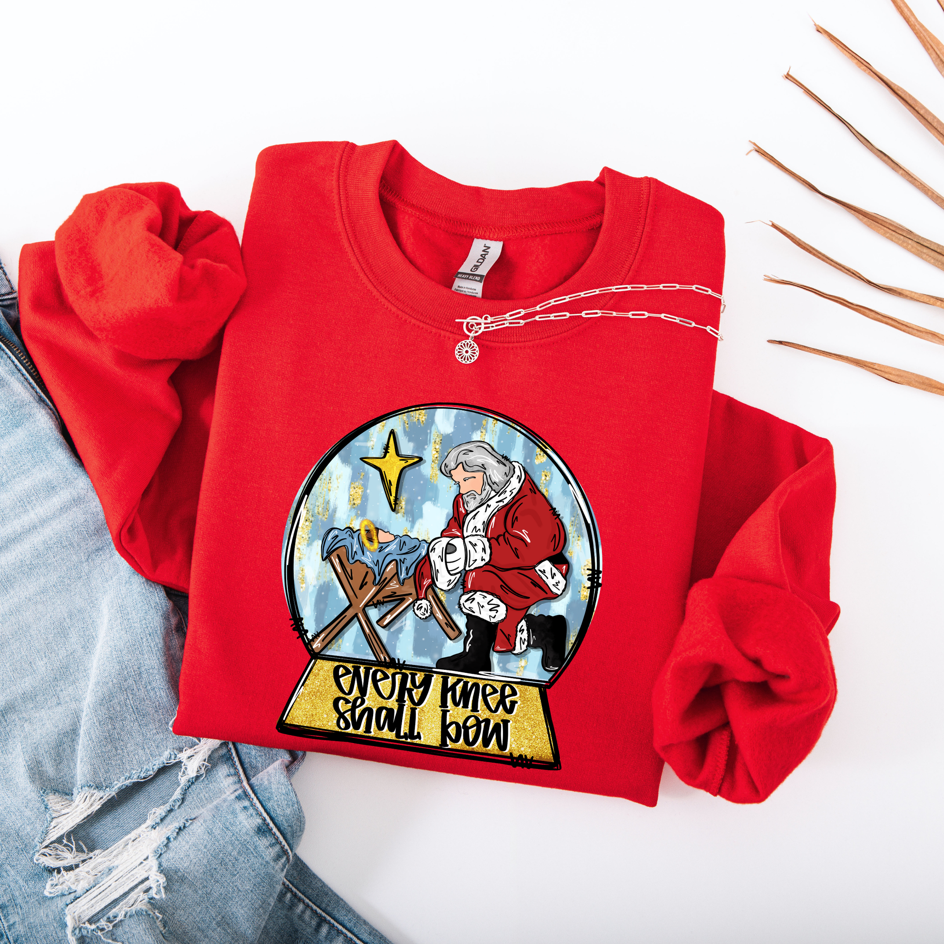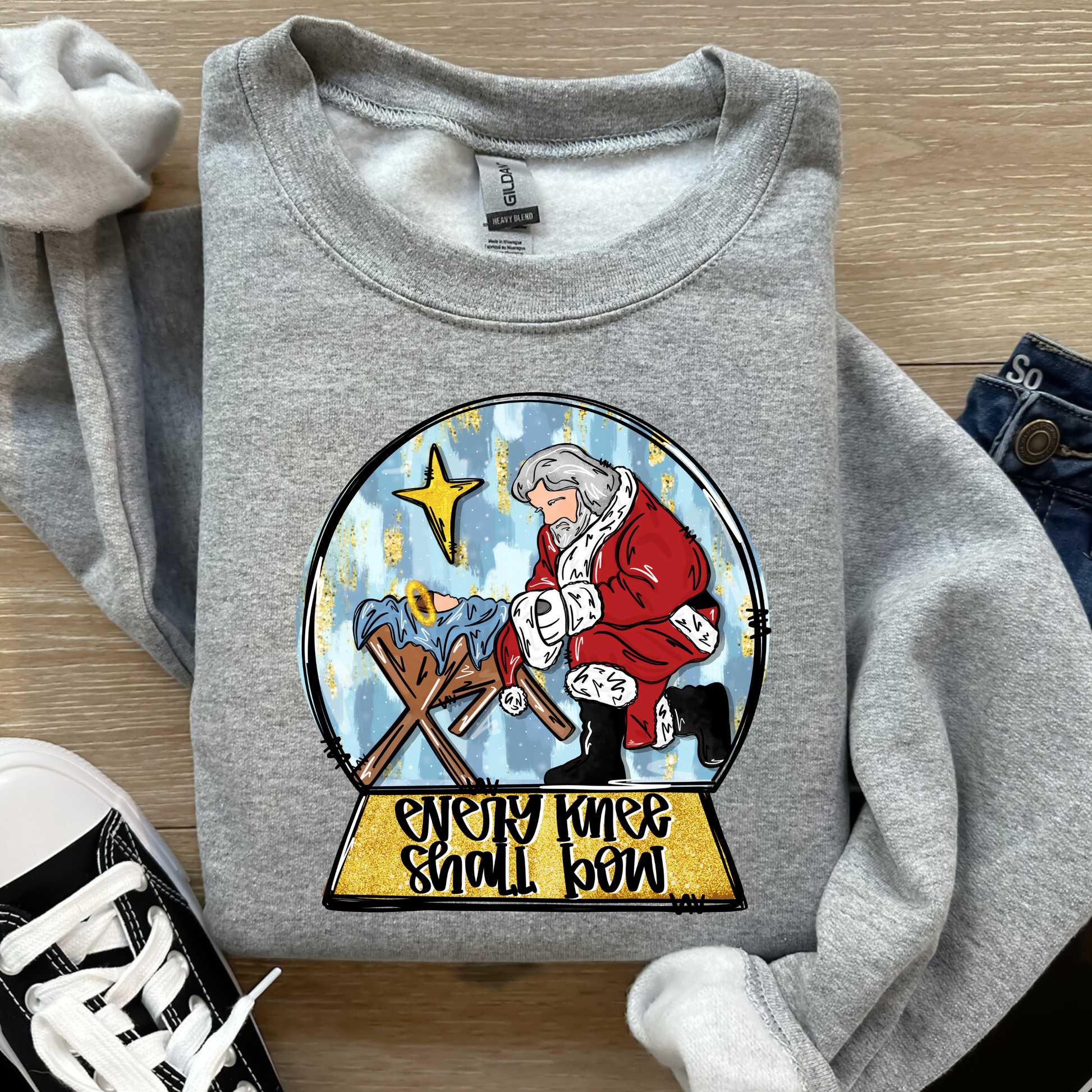 Get ready to spread Christmas cheer and celebrate the true meaning of the season with our "Every Knee Shall Bow" apparel! This isn't just another holiday garment; it's a joyful declaration of faith wrapped in festive fun. Imagine Santa, in his most heartwarming pose, leaning over the manger – a sweet reminder of the miracle we celebrate. Below this adorable image, the powerful words "Every Knee Shall Bow" proclaim the reverence of the season.