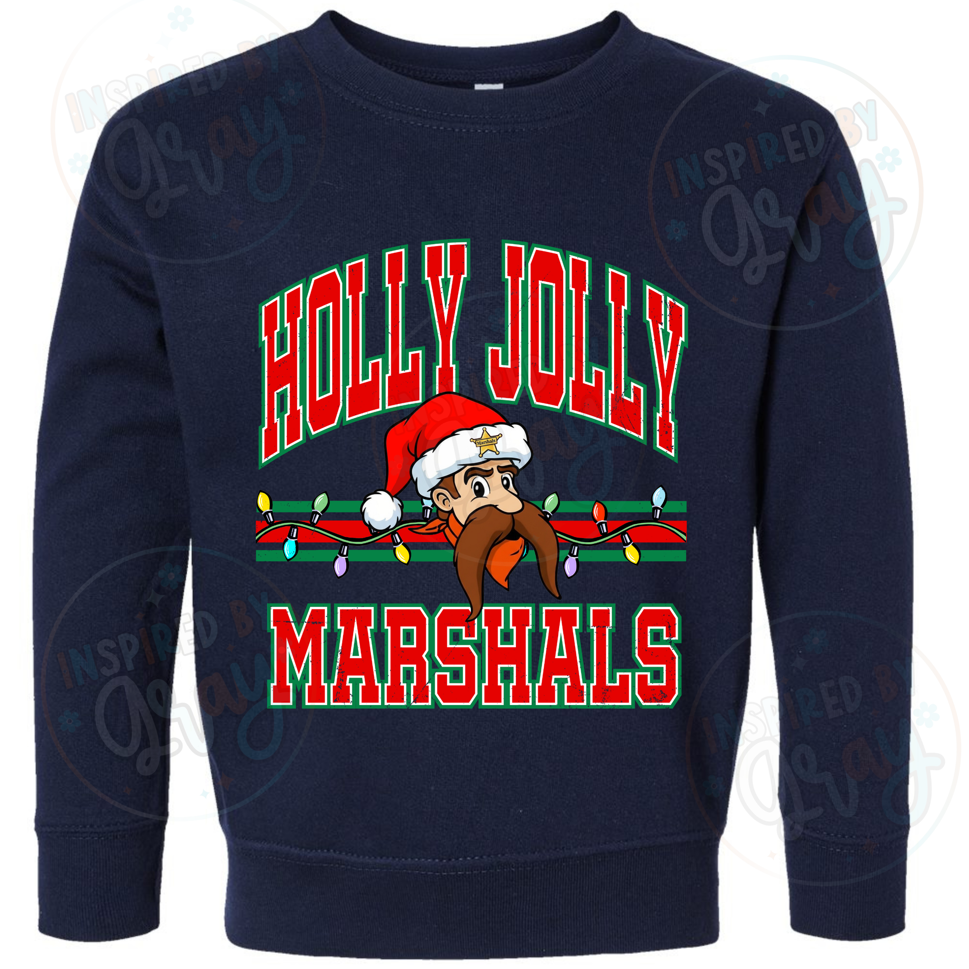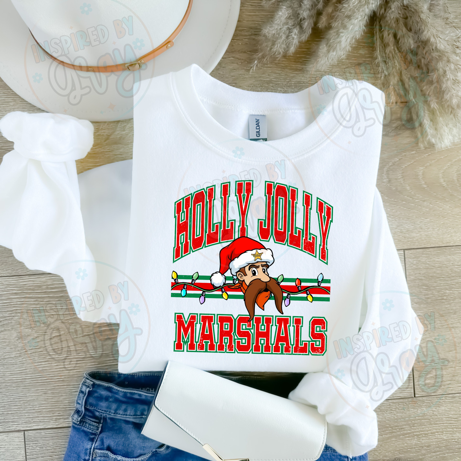 Spread holiday cheer with the Holly Jolly Marshals Shirt! This fun and festive shirt is the perfect way for teachers, students, and parents to show their school spirit this Christmas season. Featuring the beloved Marshal Man sporting a Santa hat and the words "Holly Jolly Marshals" in a bold, eye-catching print surrounded by twinkling Christmas lights, this shirt is guaranteed to bring a smile to everyone's face.