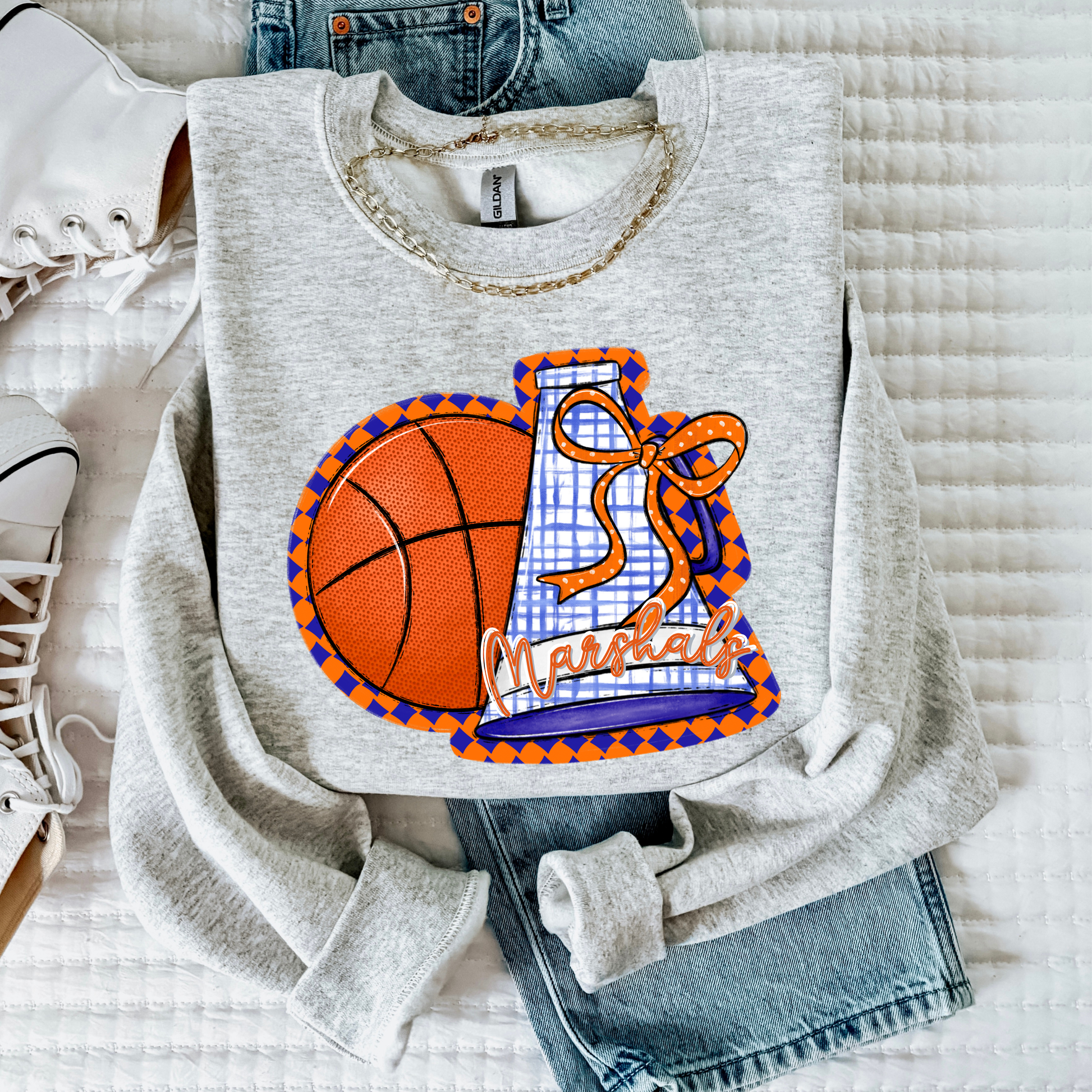 Show your team spirit and cheer on the Marshall County Marshals Basketball team in style with our adorable Marshals Basketball Megaphone Shirt! This fun and energetic design features a bold megaphone decked out with a cute bow, perfectly paired with a basketball and the word "Marshals" in a charming cursive font.