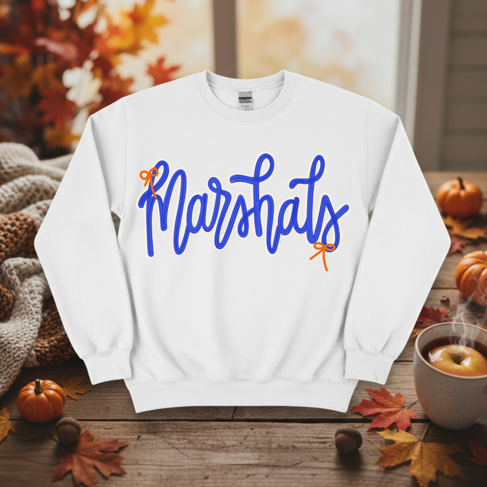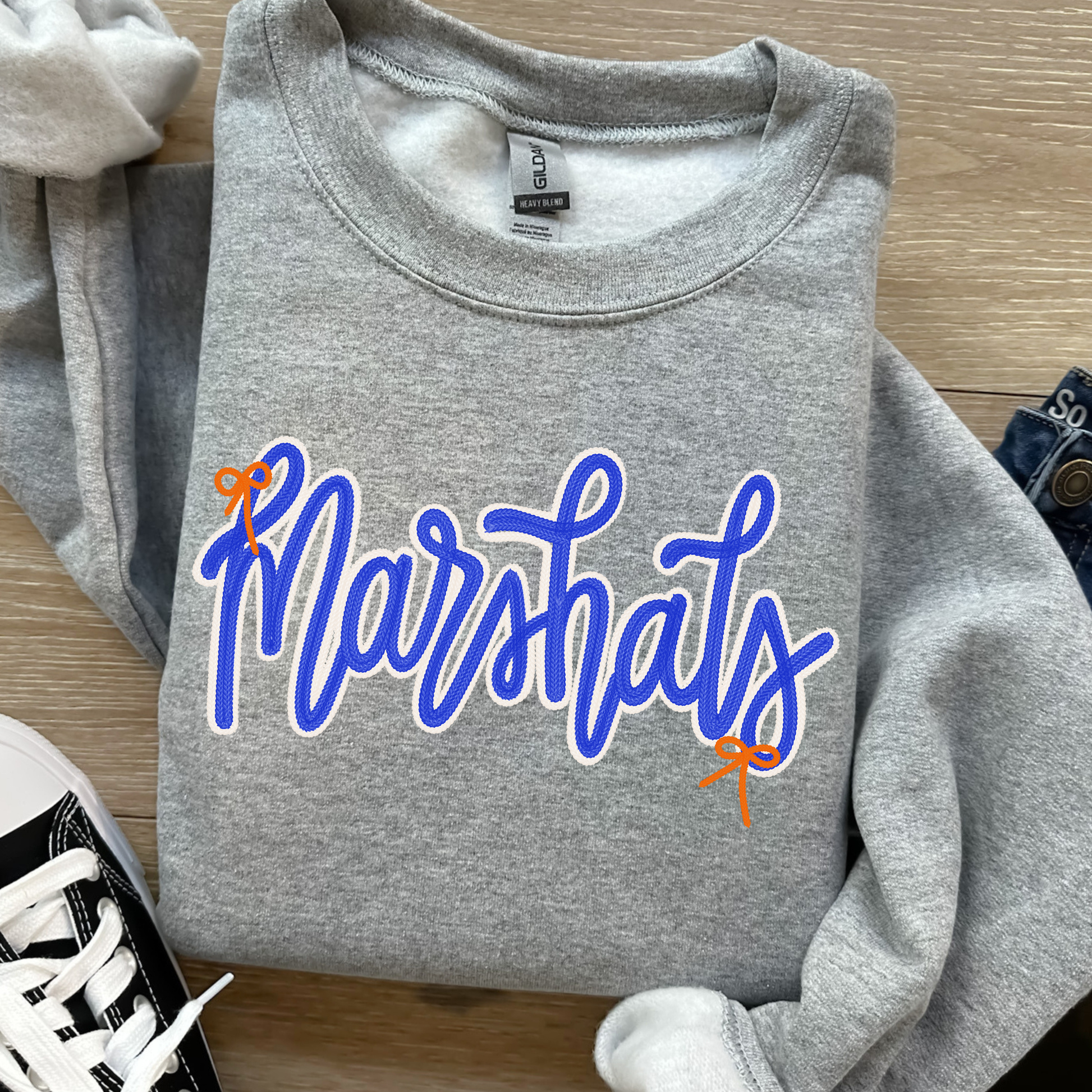 Show your school spirit in style with the Marshals Basic Shirt! This isn't just any ordinary shirt; it's a statement piece that screams "Marshals pride!" in bold, blue letters with little orange bows on the ends. It looks stitched! It's the perfect way to show your support for your favorite students.