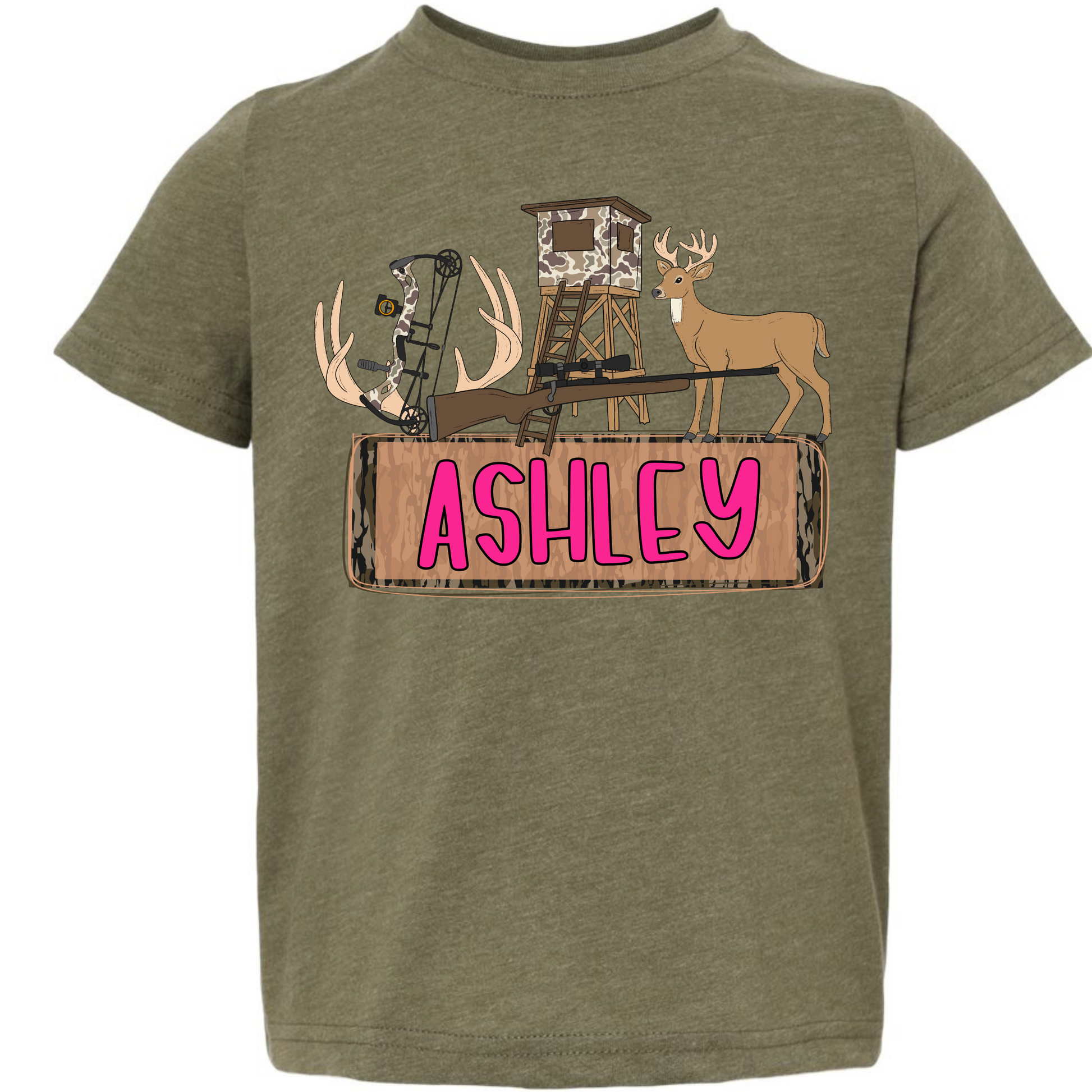 Gear up your little hunter with our Personalized Camo Deer Kids Hunting T-shirt! This isn't just another tee; it's a personalized statement piece that shows off their love for the great outdoors. Imagine the excitement as they sport their very own camo shirt, customized with their name in either classic tan or vibrant hot pink – making it uniquely theirs!